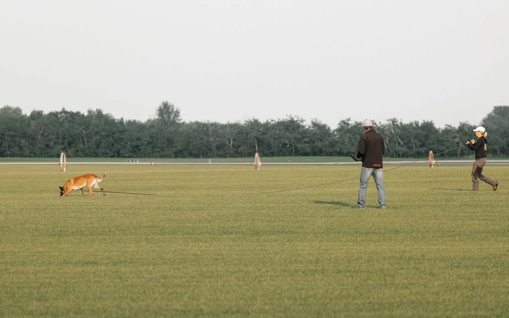 Tracking Line: The handler stays at the end of a 33ft tracking line, guiding the dog through the track.